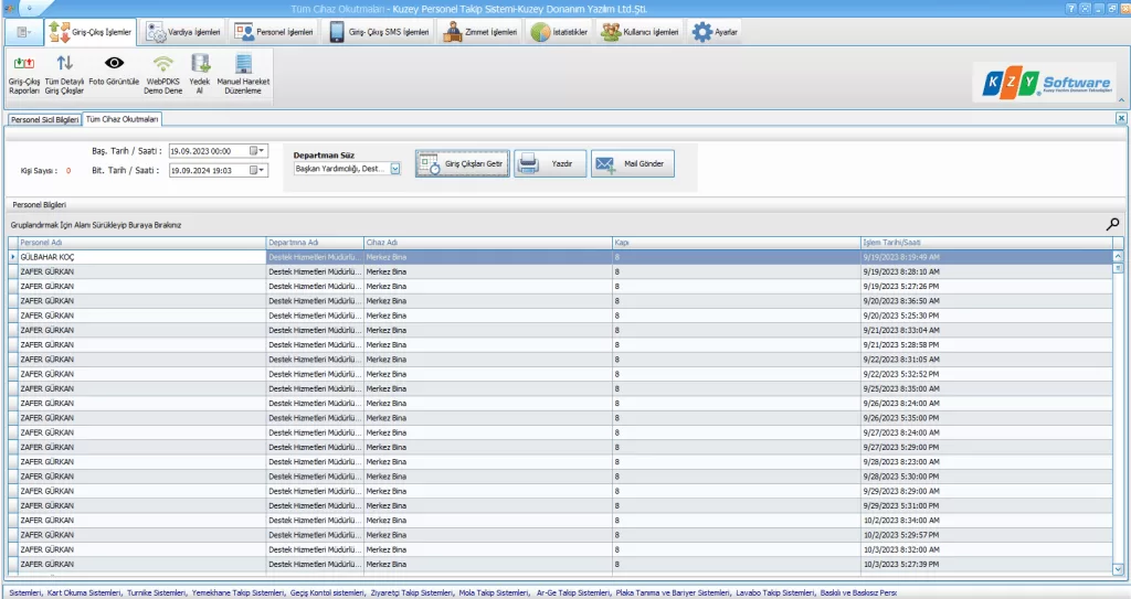 Detaylı giriş çıkış raporunun normal giriş çıkış raporundan farkı gün içerisindeki personelin yaptığı tüm kart,parmak,yüz okutmalarının tamamını görüntüleyebilir ve raporlayabilirsiniz. Normal giriş çıkış raporunda ise personelin o gün için mesaiye başladığı ve bitirdiği saati görüntüleyebilirsiniz. Bu raporları excel’e aktarabilir veya pdf vb. olarak aktarabilirsiniz.