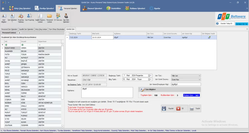 Personel günlük izin verme hesaplamasını yapmak için genellikle çalışanın çalışma süresi ve izin hakkıyla ilgili bazı faktörleri göz önünde bulundurmalısınız. Personele günlük izin vermek için personel işlemlerinden izin işlemleri butonunu tıklayın. Ardından günlük izin menüsüne girerek izinin başlangıç, bitiş bilgilerini girin. İzin türü ücret kesilip kesilmeyeceği bilgisi ve izini onaylayan kişi bilgilerini girin.