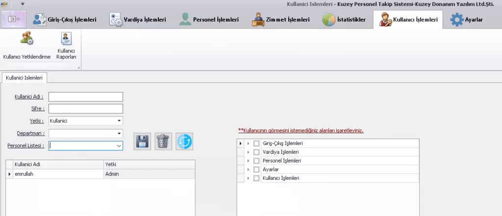 Personel takip programı açıldıktan sonra kullanıcı işlemlerini seçmelisiniz. Kullanıcı yetkilendirme butonunu tıklayarak kullanıcı işlemlerine ulaşırsınız. Bu ekrandan kullanıcı adı ve şifre belirleyerek yeni kullanıcı oluşturabilir veya mevcut kullanıcı bilgilerini değiştirebilirsiniz. Yetki alanından kullanıcı veya admin olarak kullanıcının yetkisini belirleyebilirsiniz. Sağ taraftan erişeceği menüleri belirleyebilir ve yetkilendirebilirsiniz.