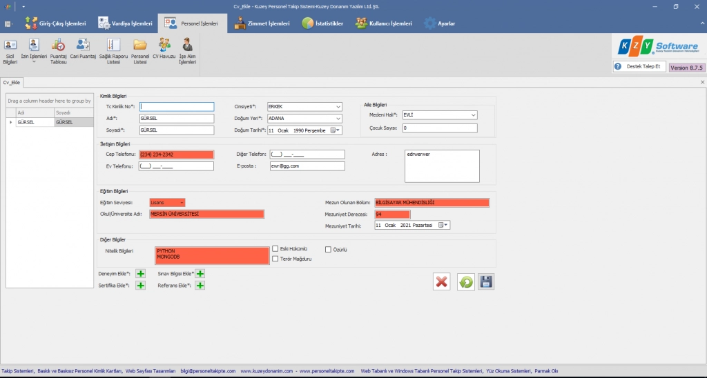 Pdks Cv Havuzu,Özgeçmiş (CV-Curriculum Vitae), iş başvurularında kişilerin kendi potansiyellerini işveren firmanıza tanıtmak amacıyla hazırlanan içerisinde kişiye ait becerilerin, deneyimlerin, eğitim durumunun, iş tecrübesinin vb. bilgilerin yer aldığı bilgileri arşivleyebilir, yazdırabilir, raporlayabilir ve ihtiyacınız doğrultusunda kullanabilirsiniz.