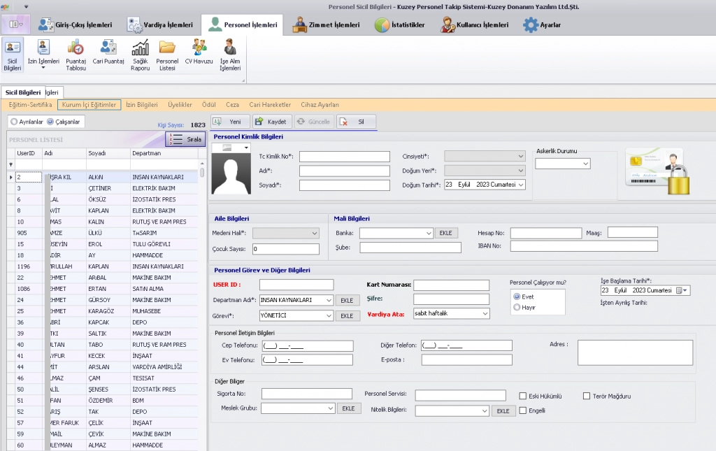 Personel takip programı açıldıktan sonra personel işlemlerini seçmelisiniz. Sicil bilgileri butonunu tıklayarak personel sicil özlük işlemlerine ulaşırsınız. Bu ekrandan yeni personel oluşturabilir veya mevcut personel bilgilerini değiştirebilirsiniz. Personele ait kimlik bilgileri, iletişim bilgileri, aile bilgileri, mali bilgiler vb. işlemleri düzenleyebilirsiniz veya raporlayabilirsiniz.