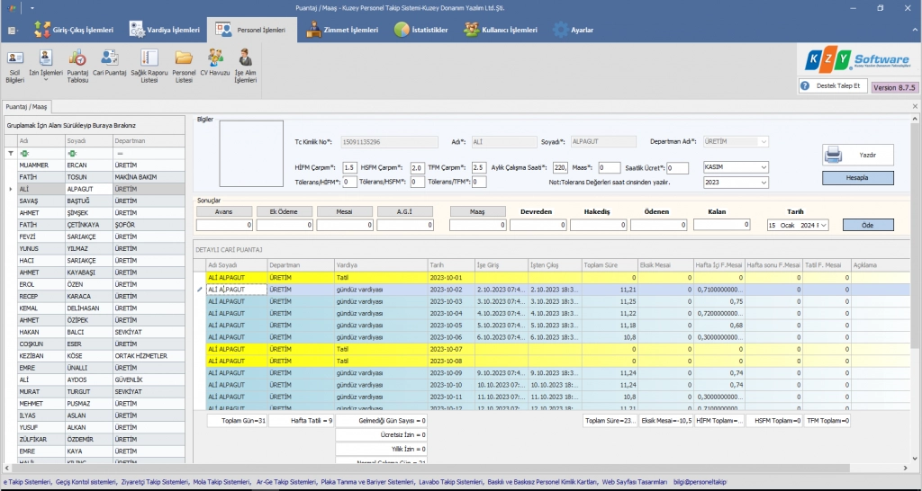- Her personelin günlük olarak çalışma saatleri kaydedilir ve bu bilgiler genellikle personel devam kontrol sistemi (PDKS) aracılığıyla Bir personel için aylık olarak toplam çalışma süreleri, izinleri, hastalık izinleri, ve benzeri bilgilerin detaylı olarak puantaj sistemi ile takip edilir.